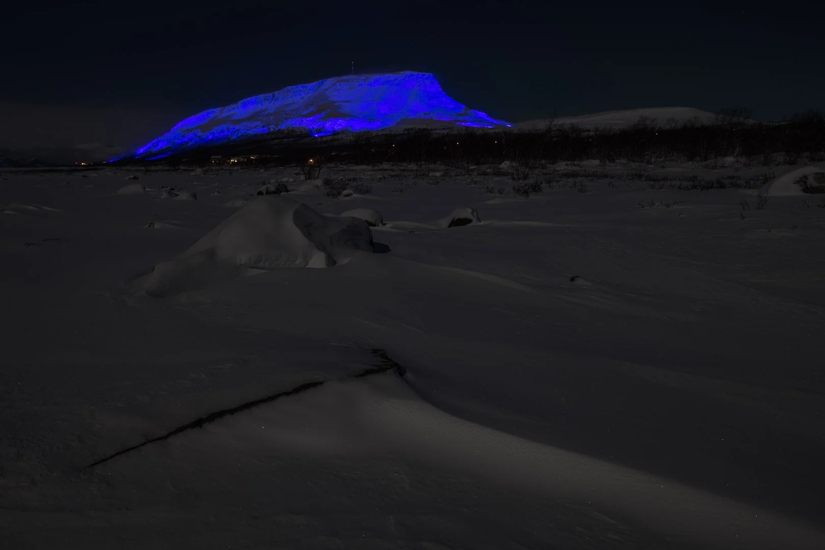 5th site was a sacred Saana mountain around 500km above arctic circle. Place is sacred for Sami people and its propably only mountain that most of the Finns will recognise. Lighted area was around 4,7km wide and from the centre around 600m high, with no roads, electricity, access and it can be -40deg of celsius there. Project was a mark that our independence belongs to every Finn, also people who are living in more isolated areas. This was implemented in a village where is only around 100-people living and lighted area was around 2,500,000m2.